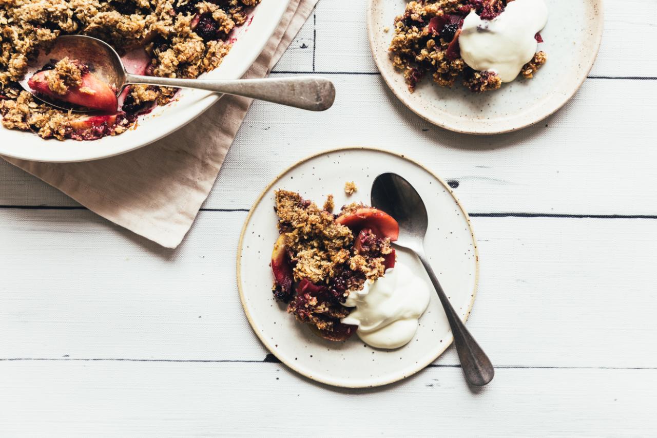Vanilje-crumblekage med æble og brombær