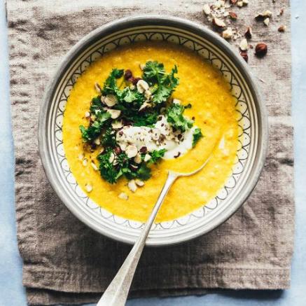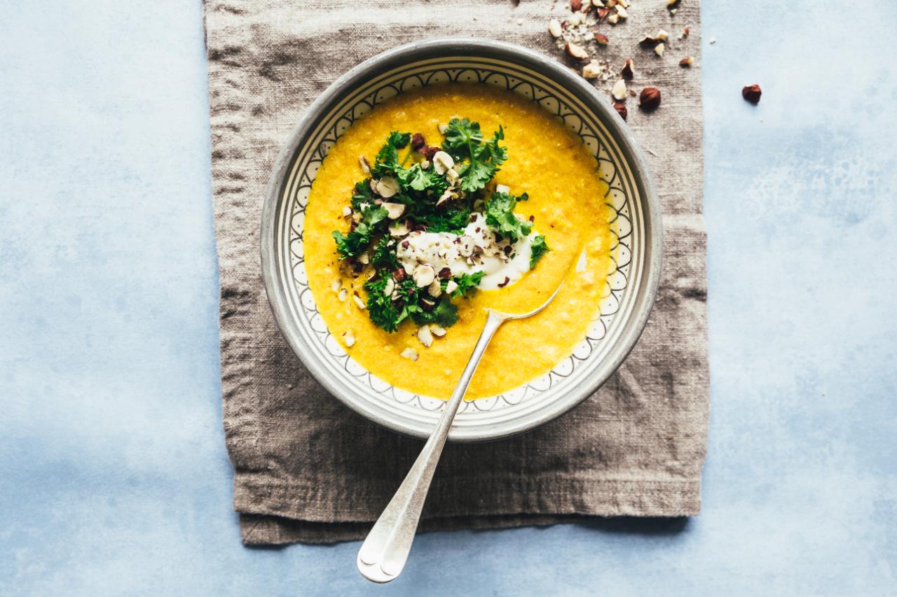 Rør Herbamare bouillonen op i det kogende vand og hæld over suppen. Skru ned og lad simre i 15-20 minutter. Imens hakker du persillen fint og hasselnødderne groft.