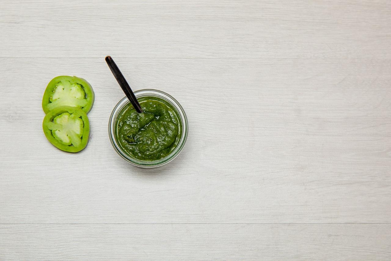En ketchup lavet på friskjuicede grønne tomater. Tilsmagt med æbleeddike og rørsukker for at fremhæve tomaten. Et dejlig frisk tilbehør, som passer godt til milde og mellemstærke oste