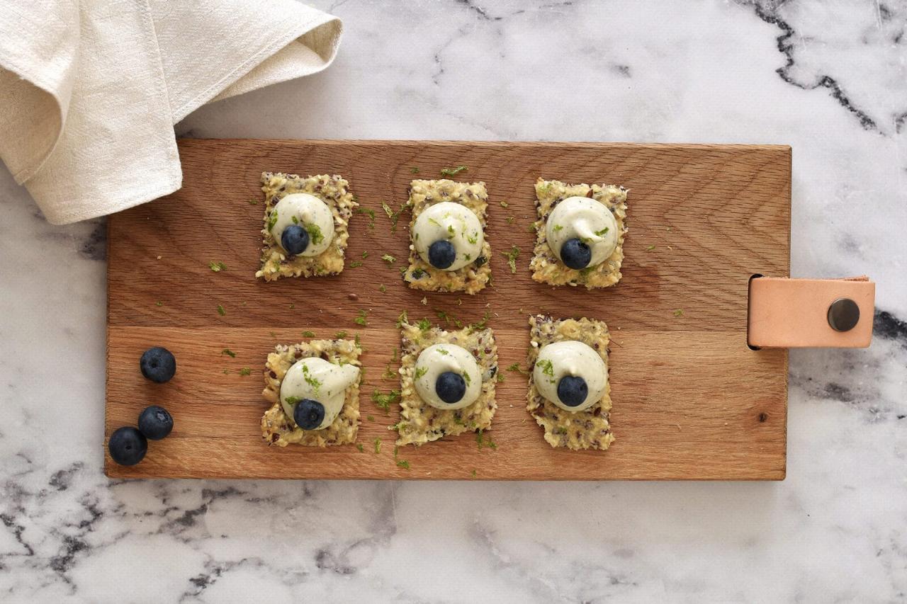 Smør på knækbrød og top med et blåbær og revet limeskal.